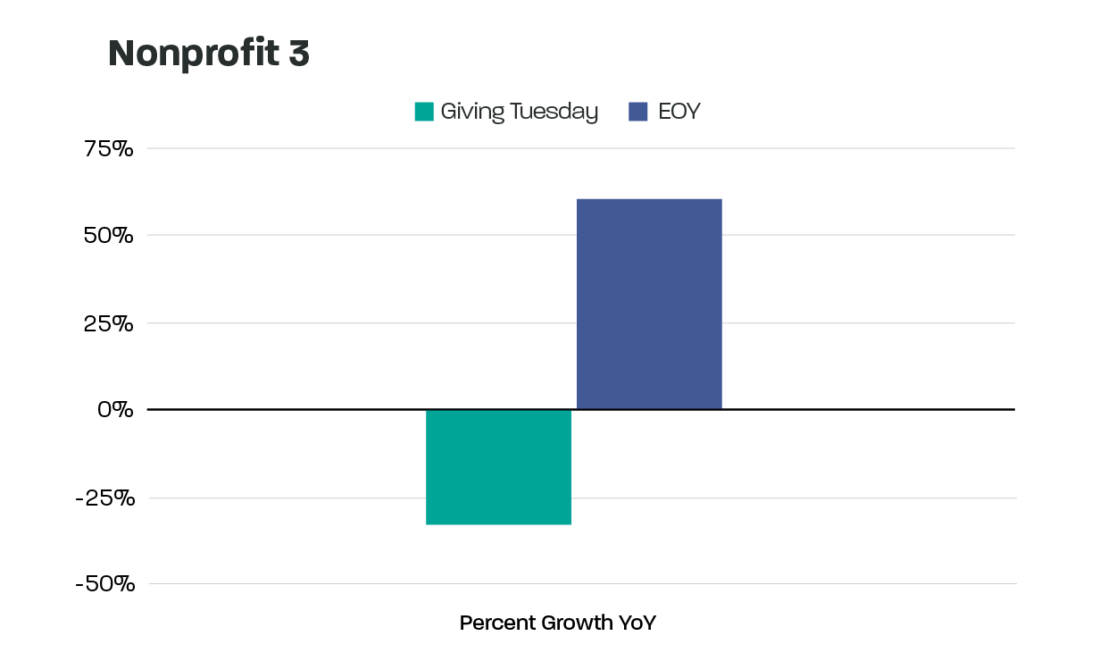 Here’s how Giving Tuesday and end-of-year YOY revenue growth looked for three of our nonprofit partners: