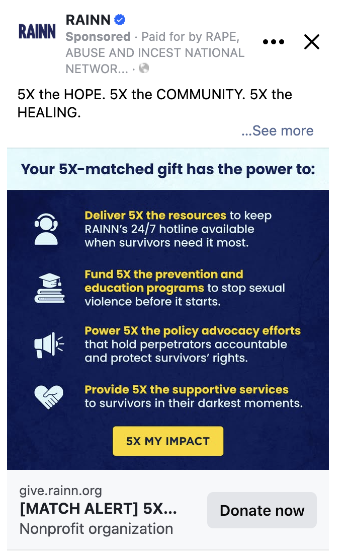 Our partners have taken email appeals to the next level with donation buttons that feature match math, eye-catching visuals, and equivalencies that tell donors the real tangible impact of their gifts. Optimized creative like this drove top-performing emails and ads for a few of our partners.