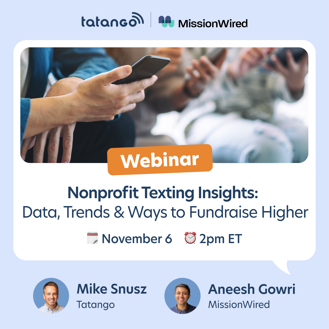 Don’t miss our upcoming webinar with Tatango featuring the report’s authors – MissionWired’s Aneesh Gowri, VP, SMS & Strategy Director, and Tatango’s Mike Snusz, Director of Nonprofit Customer Experience – on Thursday, Nov. 6 at 2 p.m. ET.